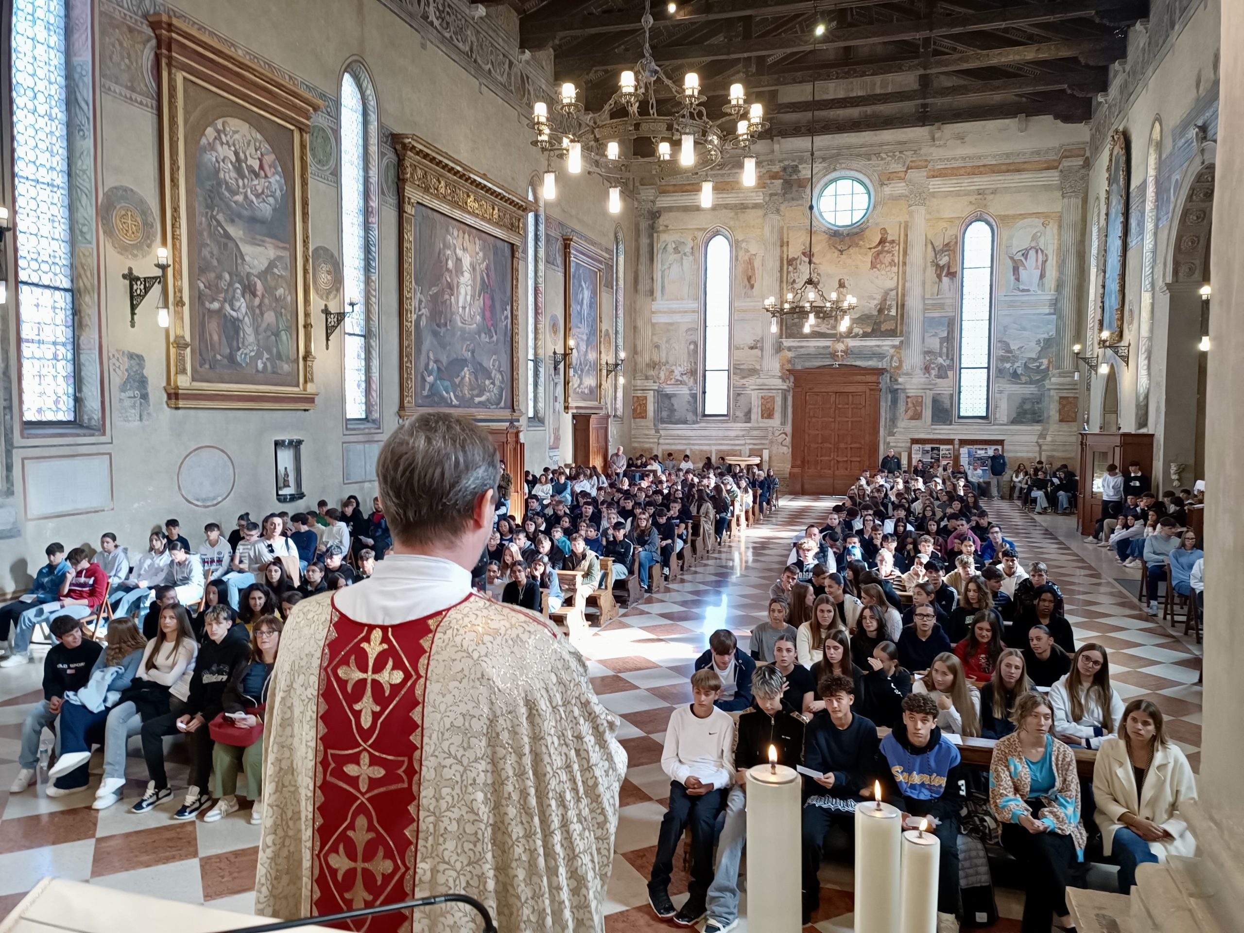 Quest’anno c’era un ospite speciale: il Vescovo Riccardo! È stato lui a presiedere la celebrazione con la presenza di altri 10 sacerdoti. Ad accoglierlo ben 547 giovani con una quarantina d’insegnanti presenti. È stato veramente bello vedere il Duomo d’Oderzo gremito di giovani.