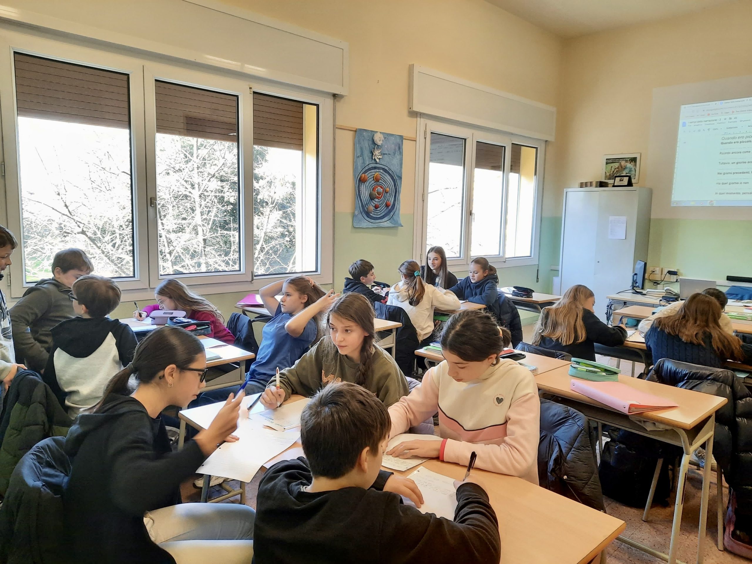 L’attività consisteva nello scrivere in modo cooperativo, unendo le idee di ciascun partecipante per creare un testo condiviso. Successivamente, i ragazzi si sono dedicati ad un momento di analisi e riflessione, concentrandosi sull’uso dei tempi verbali nel racconto e approfondendo come questi possano influenzare il ritmo e l’efficacia della narrazione.