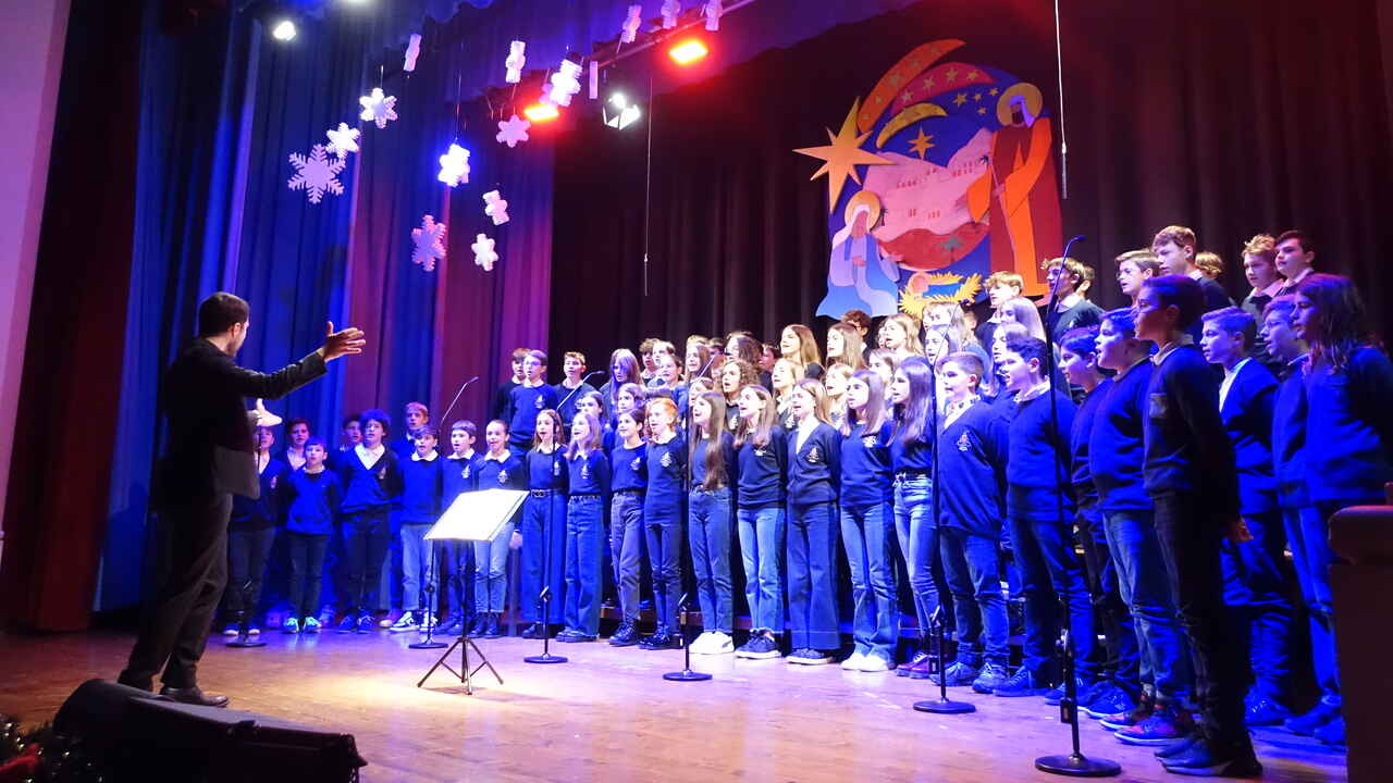 Le classi si sono alternate in teatro in tre momenti distinti, a seconda dell’età. Ogni gruppo di studenti ha interpretato, cantando (e a tratti pure ballando e suonando!), brani in più lingue, diretto dal professor Dozzo. Quest’anno, inoltre, alcuni ragazzi hanno collaborato con i professori di arte alla realizzazione della scenografia, raffigurante un presepe.