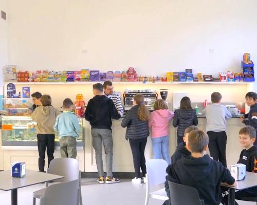 Il nostro bar scolastico è un luogo accogliente e vivace dove studenti, insegnanti, genitori e frequentatori degli spazi sportivi si ritrovano per rilassarsi, socializzare e gustare una varietà di bevande e snack. Con un'atmosfera calorosa e familiare, il nostro bar offre un servizio rapido e cortese, garantendo un'esperienza piacevole a tutti i suoi clienti. Un luogo ideale per fare una pausa in compagnia o per condividere momenti di convivialità dopo l'attività sportiva.